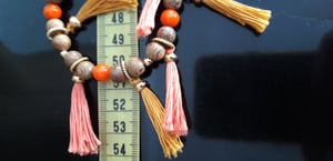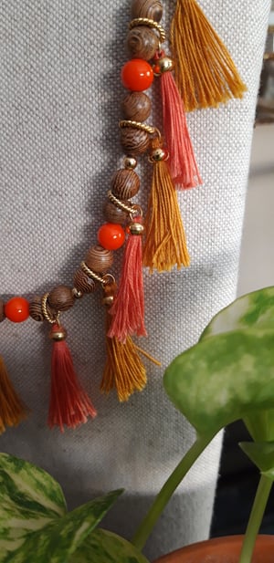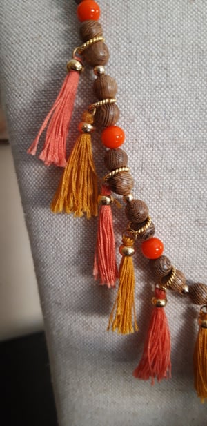 Preciós collaret de fusta i vidre amb borla. És llarg. Per portar cada dia de manera informal. Una versió llarga i una més curta. Els pots portar junts o per separat. Queda perfecte de totes maneres.