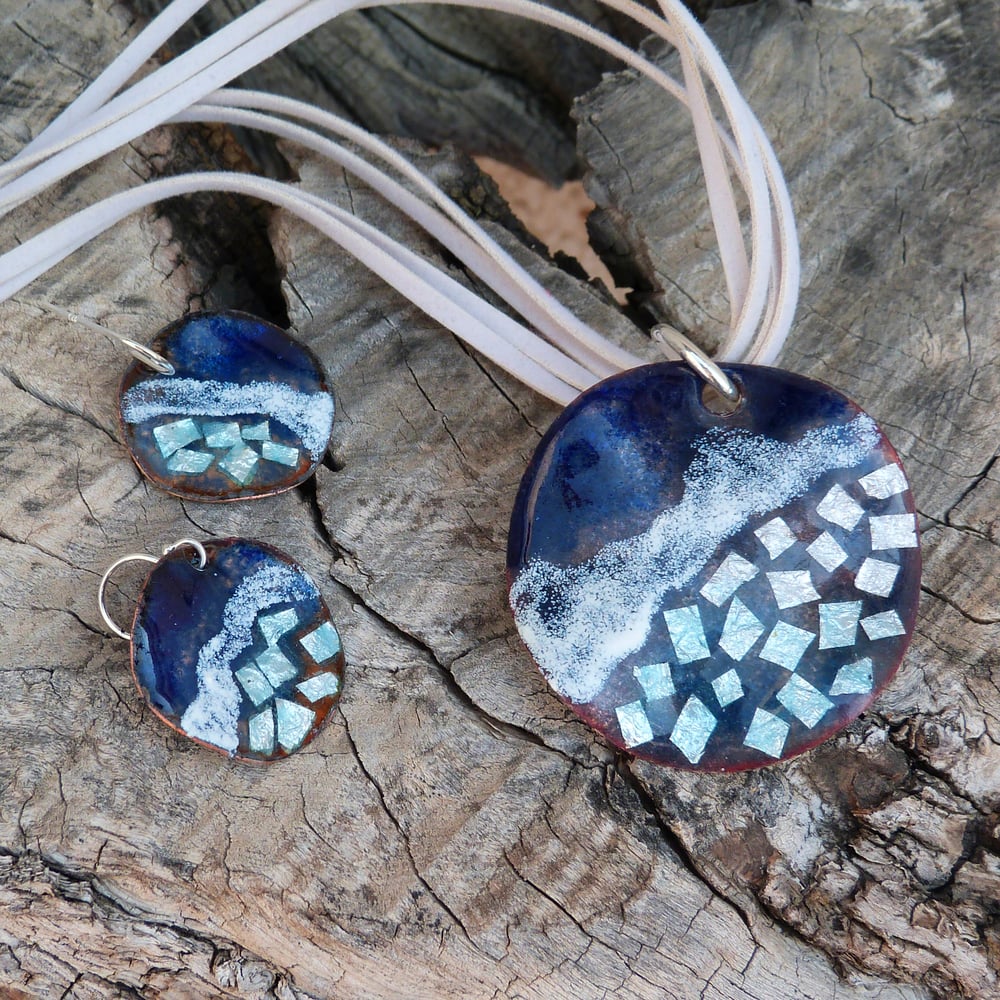 Joies de coure esmaltat (650º) amb pailló de plata de llei. Acabats i anella en plata de llei. Cordó de seda.